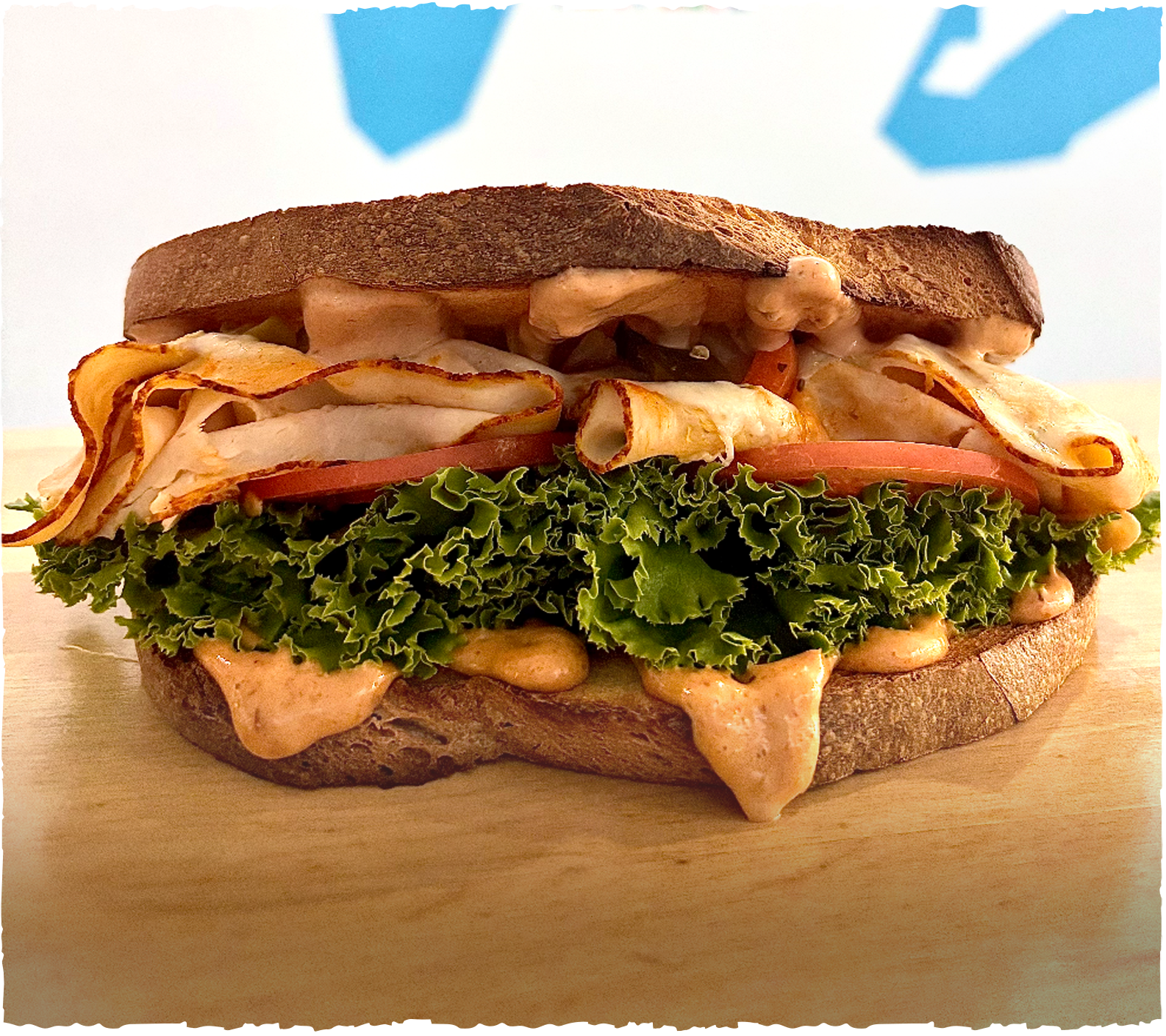 Chicken, bacon, pepper jack & spicy giardiniera grilled on sourdough with lettuce, tomato & chipotle mayo